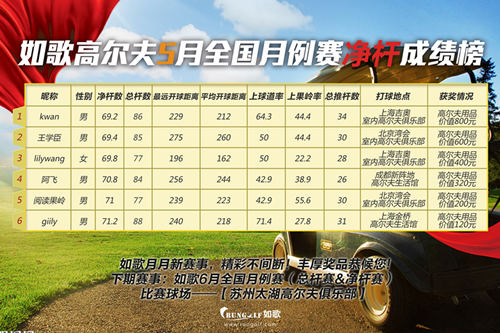 根據(jù)如歌官方《賽事規(guī)則》(各經(jīng)營場所的駐場職業(yè)教練參加比賽者,只排名,不頒獎),總桿和凈桿前六名的排名及獲獎情況如下: