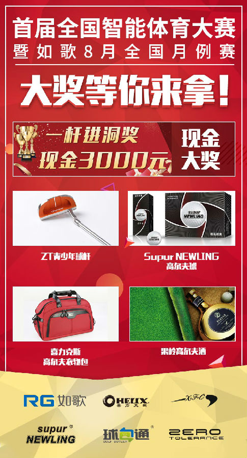 本次比賽獎(jiǎng)金獎(jiǎng)品樣樣齊全!全國(guó)智能體育大賽領(lǐng)銜,ZT零公差高爾夫私人定制、鴻舟制球、喜力克斯、昕風(fēng)采、果嶺高爾夫酒聯(lián)合贊助,ZT球桿、Supur NEWLING超遠(yuǎn)距離高爾夫球、喜力克斯衣物包、昕風(fēng)采腰帶、果嶺高爾夫酒等豐富獎(jiǎng)品及一桿進(jìn)洞3000元現(xiàn)金大獎(jiǎng)恭候其主!成績(jī)獎(jiǎng)、鼓勵(lì)獎(jiǎng)、跳跳獎(jiǎng)、球館獎(jiǎng)、現(xiàn)金獎(jiǎng)……只要參賽并完整打完一場(chǎng)18洞,即有機(jī)會(huì)獲獎(jiǎng)!
