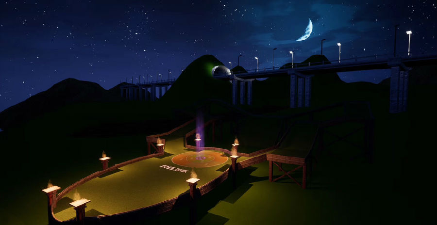 與迷你九洞的環(huán)境風(fēng)格一致,推桿大師和揮桿游戲均使用了夜晚星空為主題。推桿大師以中世紀(jì)古堡為背景,球道果嶺設(shè)置在古堡外圍,以火把為照明光源,照亮球洞附近的分?jǐn)?shù)標(biāo)靶;揮桿游戲跳出了地球,以外太空為背景,極具科技感的飛船和橋梁,得分區(qū)使用了從底部往上照射的光源,令目標(biāo)區(qū)域更明顯。