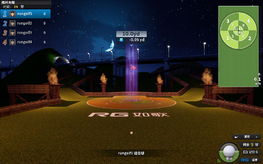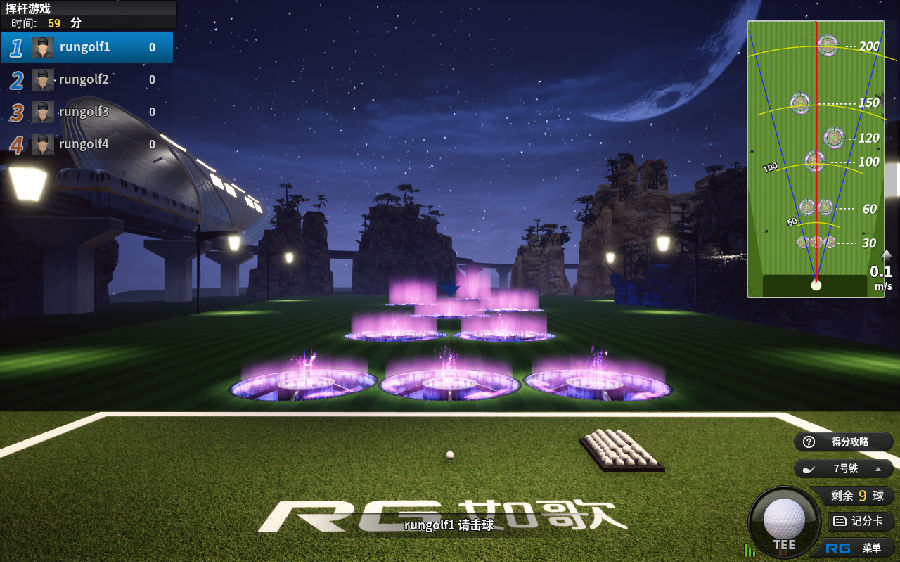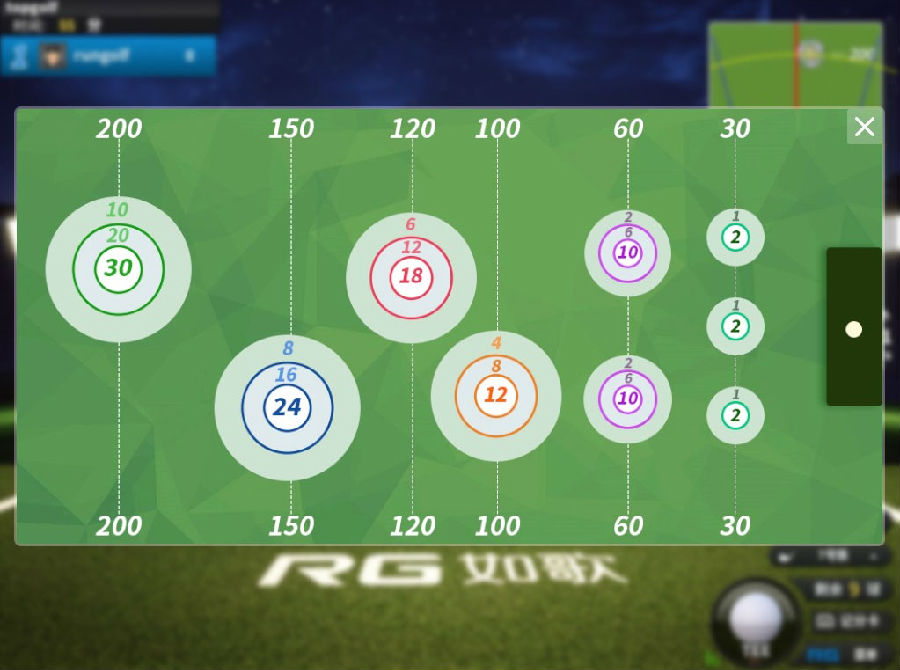 揮桿游戲在不同的距離設(shè)置了多個(gè)大型燈光洞杯,球需要擊入洞杯方可得分。根據(jù)距離和球擊入的位置設(shè)有不同的分值,距離越遠(yuǎn)的洞杯分值越高,越靠近洞杯中心分值也越高。