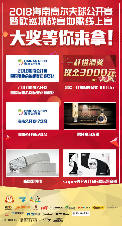 參與海南高爾夫球公開(kāi)賽暨歐巡挑戰(zhàn)賽如歌線上賽將有機(jī)會(huì)贏取去往2018海南公開(kāi)賽暨國(guó)際業(yè)余錦標(biāo)賽正賽資格,也有機(jī)會(huì)把一桿進(jìn)洞3000元現(xiàn)金、海南公開(kāi)賽紀(jì)念品、果嶺高爾夫酒、昕風(fēng)采腰帶、supur NEWLING超遠(yuǎn)距離球等豐富獎(jiǎng)品收入囊中!感謝PUMA、研藝工坊、果嶺高爾夫酒、昕風(fēng)采、鴻舟制球等品牌企業(yè)對(duì)海南高爾夫球公開(kāi)賽暨歐巡挑戰(zhàn)賽如歌線上賽的支持!
