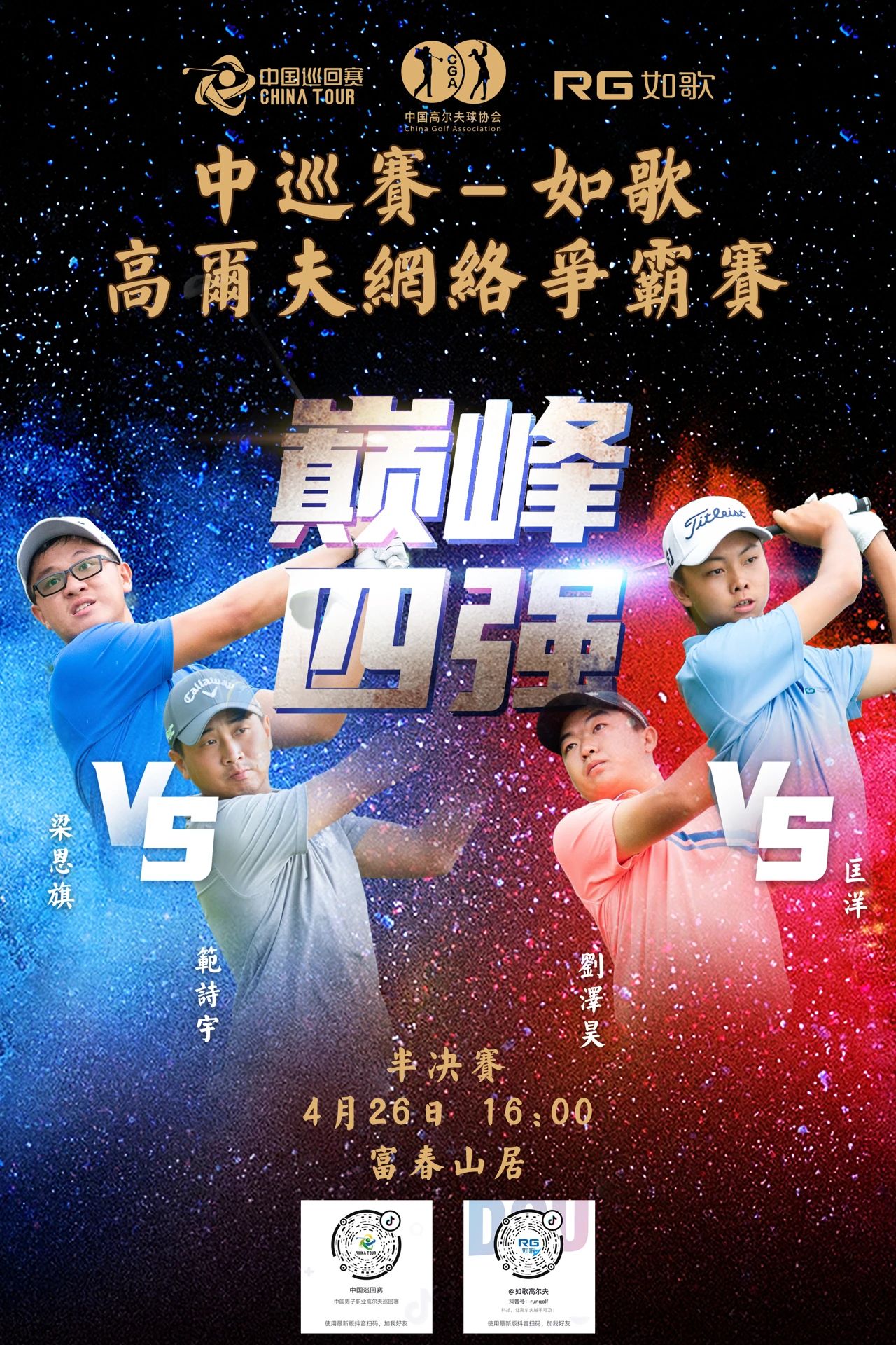 4月24日,經(jīng)過(guò)近9個(gè)小時(shí)的32進(jìn)16、16進(jìn)8、8進(jìn)4的激烈角逐后,匡洋、劉澤昊、范詩(shī)宇、梁恩旗四位選手成功挺進(jìn)四強(qiáng)。4月26日16:00在深圳沙河棕櫚泉國(guó)際高爾夫?qū)W院室內(nèi)球館舉行的半決賽中,匡洋對(duì)陣劉澤昊,范詩(shī)宇對(duì)陣梁恩旗,兩場(chǎng)勝者將在19:30爭(zhēng)奪最終的冠軍獎(jiǎng)杯,以及與賽事特邀嘉賓梁文沖現(xiàn)場(chǎng)PK的機(jī)會(huì)。